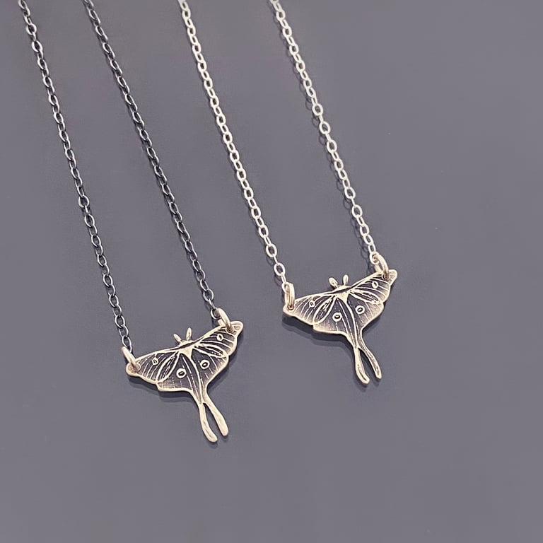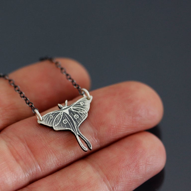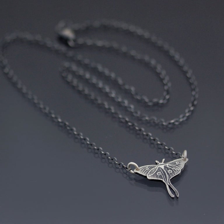 A smaller version of the Luna Moth Necklace, this necklace features a hand drawn luna moth design that has been etched and hand cut from a sheet of sterling silver. It has been given an oxidized, brushed finish. The moth measures approximately 11/16" x 11/16". A sterling silver chain is attached at the sides of this piece. The sterling silver chain is available in either an oxidized (darkened) finish or bright silver finish.
