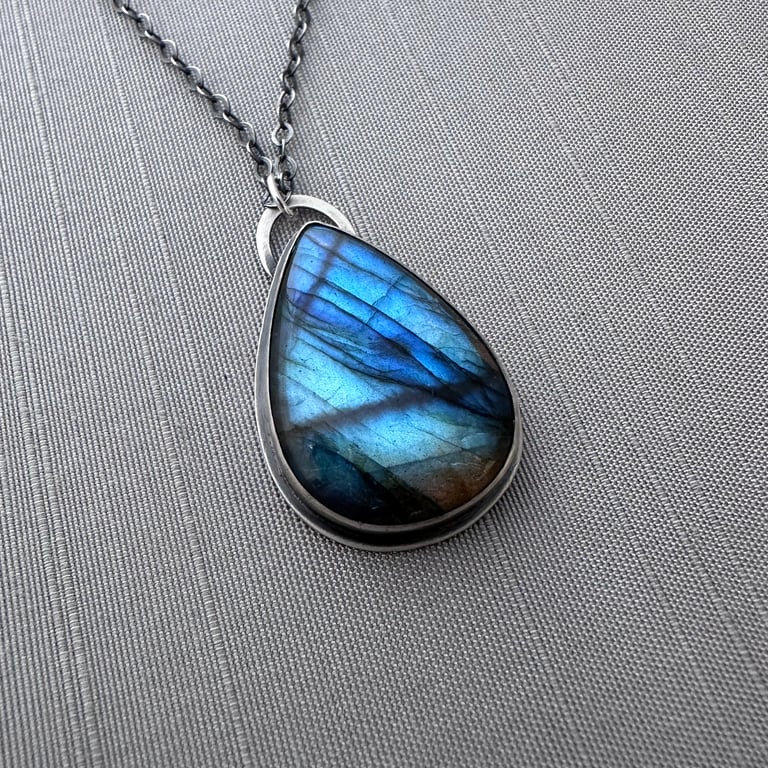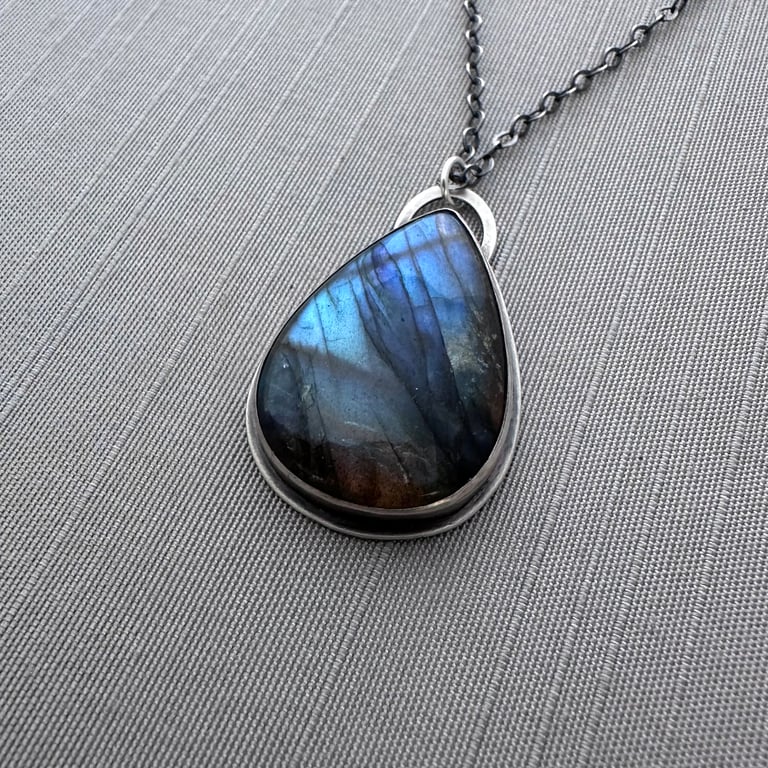 This necklace features a beautiful labradorite cabochon in a hand fabricated sterling silver setting. This stone has beautiful depth and flashes of color. The silver has been given a brushed, oxidized finish. The pendant measures approximately 1-1/2" x 15/16 and it hangs from an oxidized sterling silver chain.