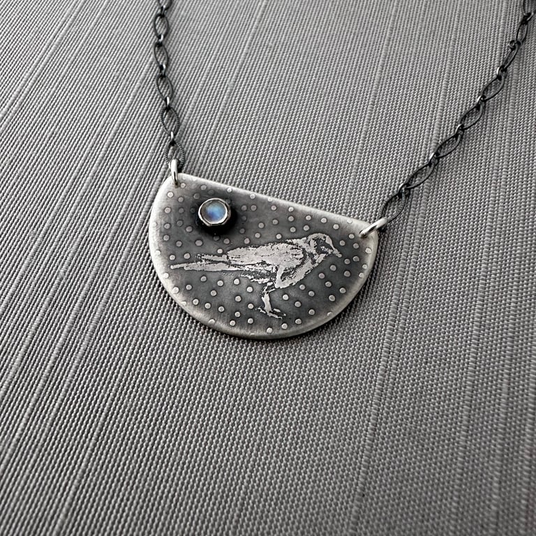 This necklace features my hand drawn crow and starry background etched into sterling silver. I’ve added a 3 mm rainbow moonstone cabochon to this piece. It has been given an oxidized, brushed finish. It measures approximately 3/4" x 1" and hangs from an oxidized sterling silver chain.