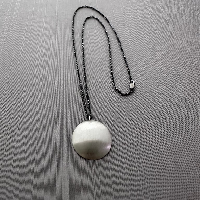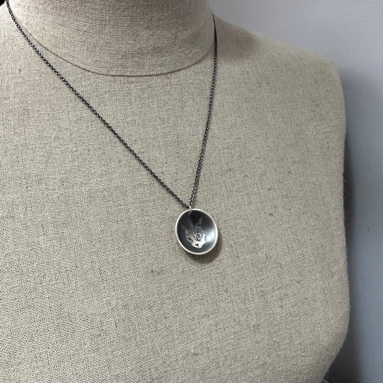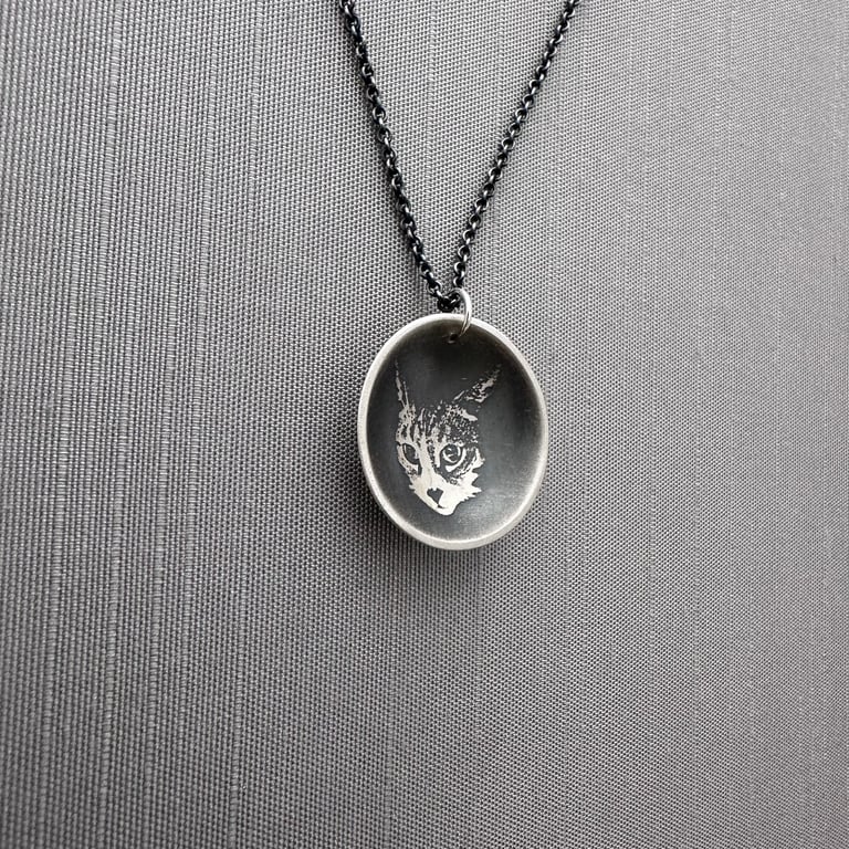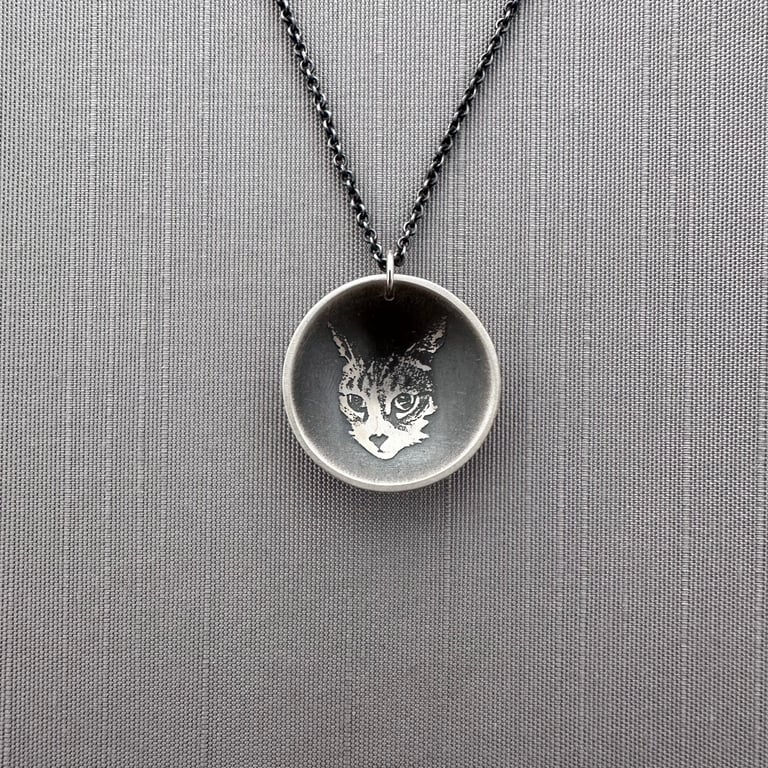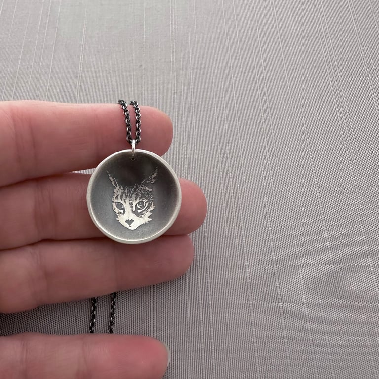 This necklace features my original tabby cat peaking out of the shadows design etched into a sterling silver saucer. The etched design has been oxidized and the pendant has been given a brushed finish. The pendant measures approximately 15/16” in diameter and hangs from a sterling silver chain. The sterling chain is available in either an oxidized silver finished (pictured) or bright silver finish.