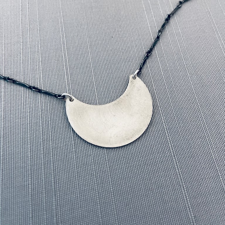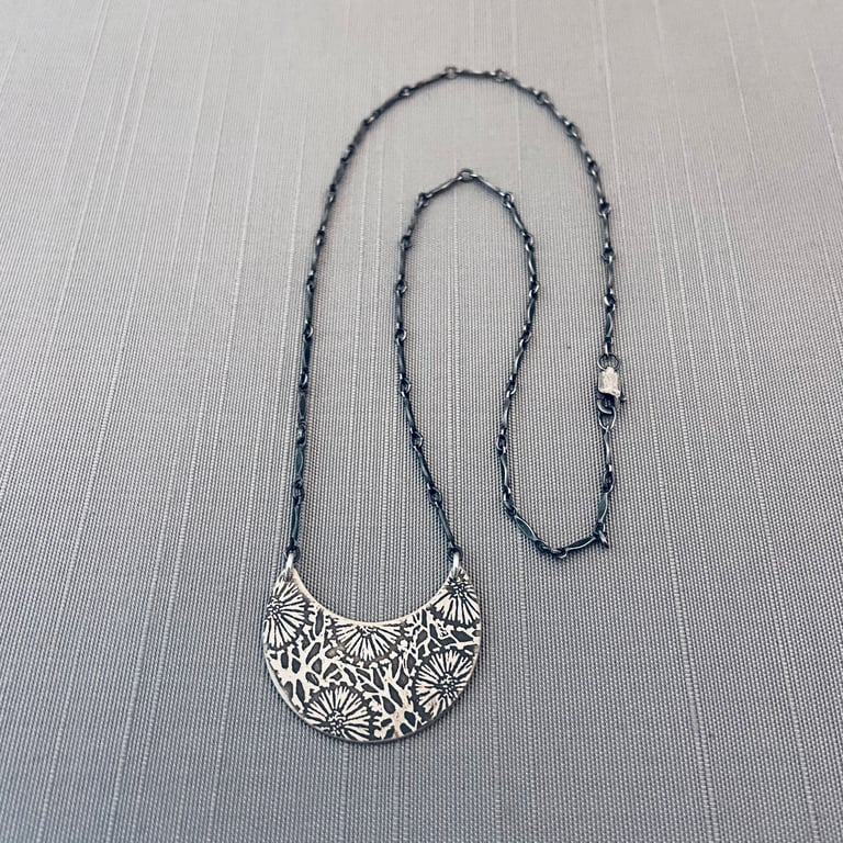 This sterling silver necklace features my hand drawn fossil pattern etched into a silver crescent. It has been given an oxidized, brushed finish. The crescent measures approximately 1-1/8x 7/8” and hangs from an oxidized sterling silver chain attached at the top corners.