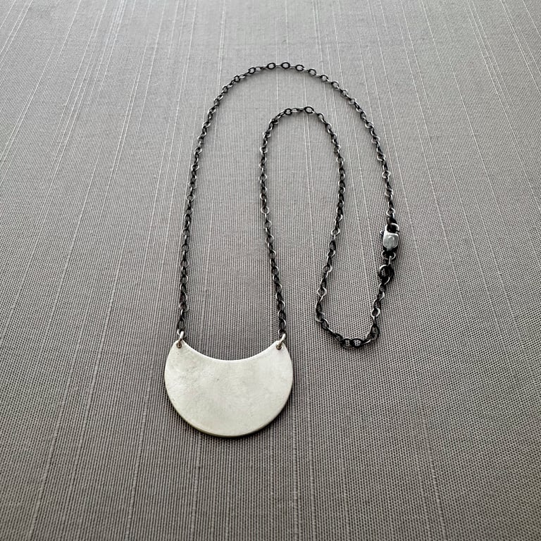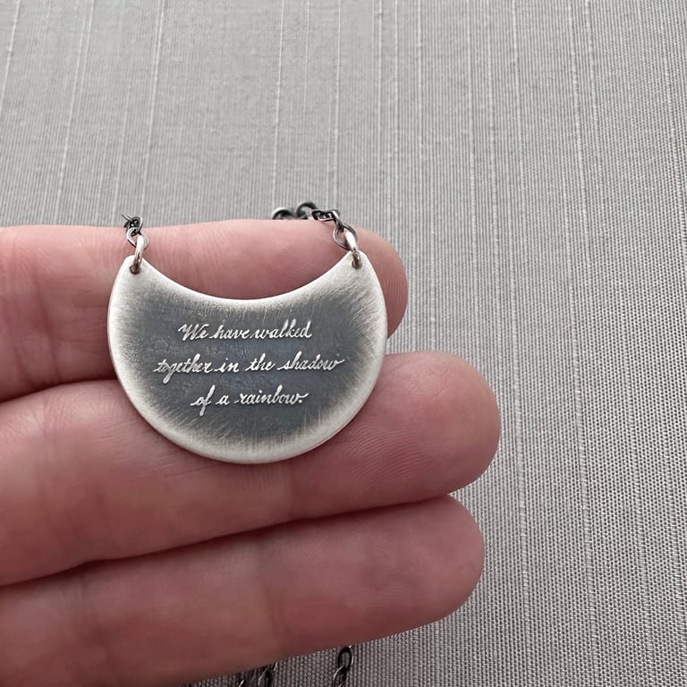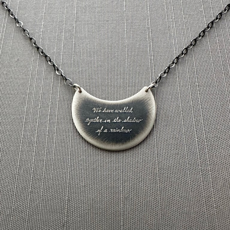 This necklace features a Native American sentiment, "We have walked together in the shadow of a rainbow." I've handwritten and etched these words into a sterling silver crescent. The pendant has been given an oxidized, brushed finish. It measures approximately 1-1/8" across. The oxidized sterling silver chain is available in several lengths.
