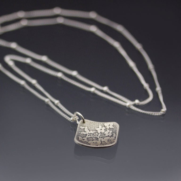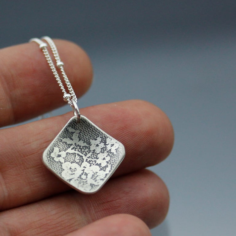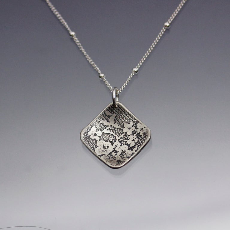 This necklace features vintage lace imprinted into a hand formed, sterling silver square that has been given a gentle, concave form. It has been given oxidized, brushed finish to highlight its delicate texture and detail. It measures just under 5/8" x 5/8" and hangs from an oxidized sterling silver chain.