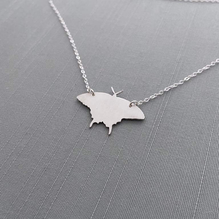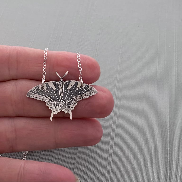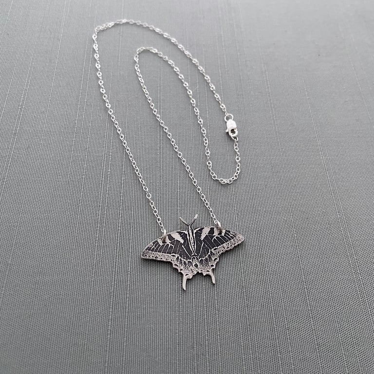This sterling silver necklace features my etched and hand cut Eastern Tiger Swallowtail butterfly. It has been given an oxidized, brushed finish. It measures approximately 3/4' x 1 1/4" and hangs from a sterling silver chain. Choose either a bright silver chain (as pictured) or an oxidized (darkened) silver chain.