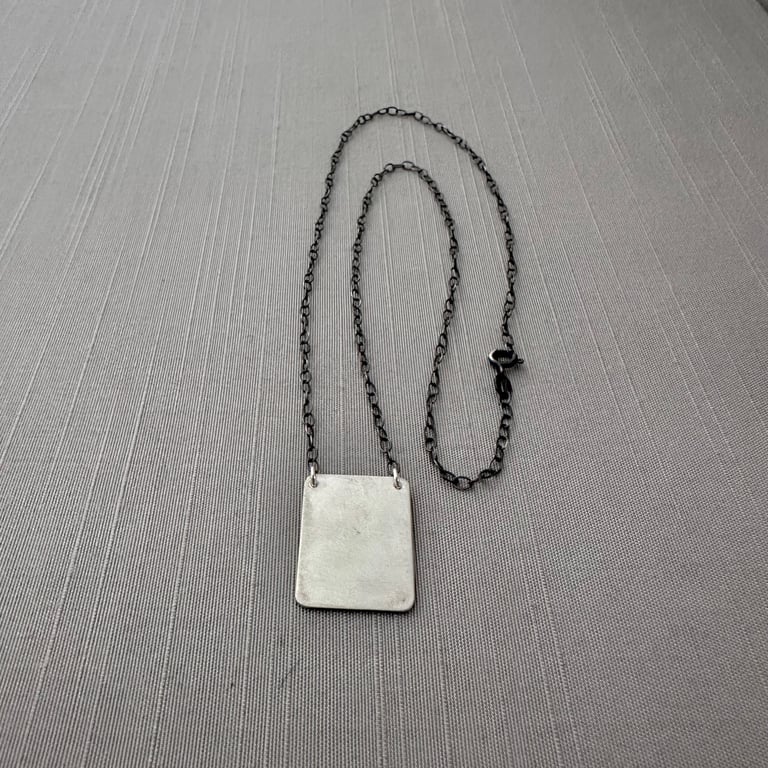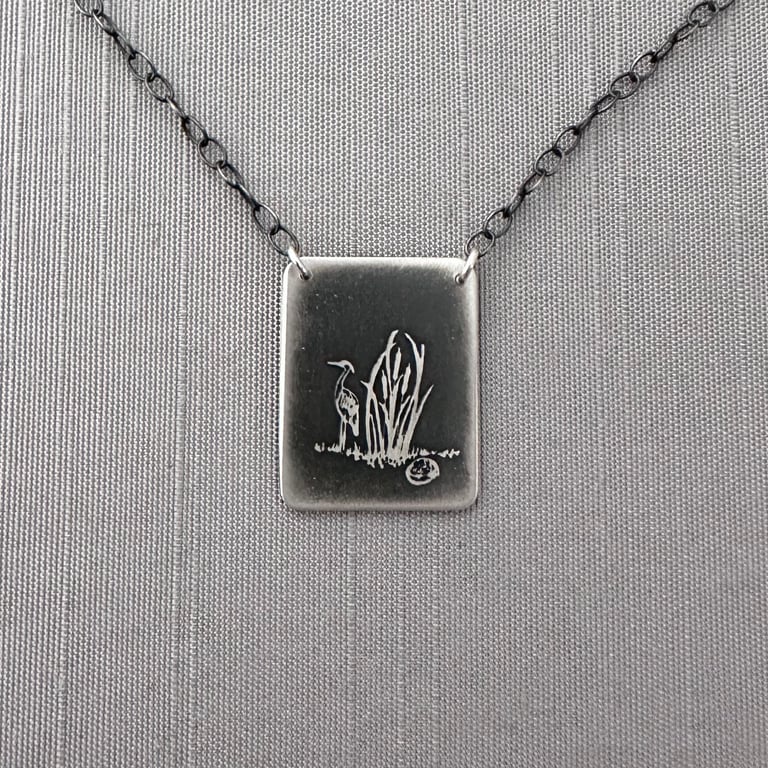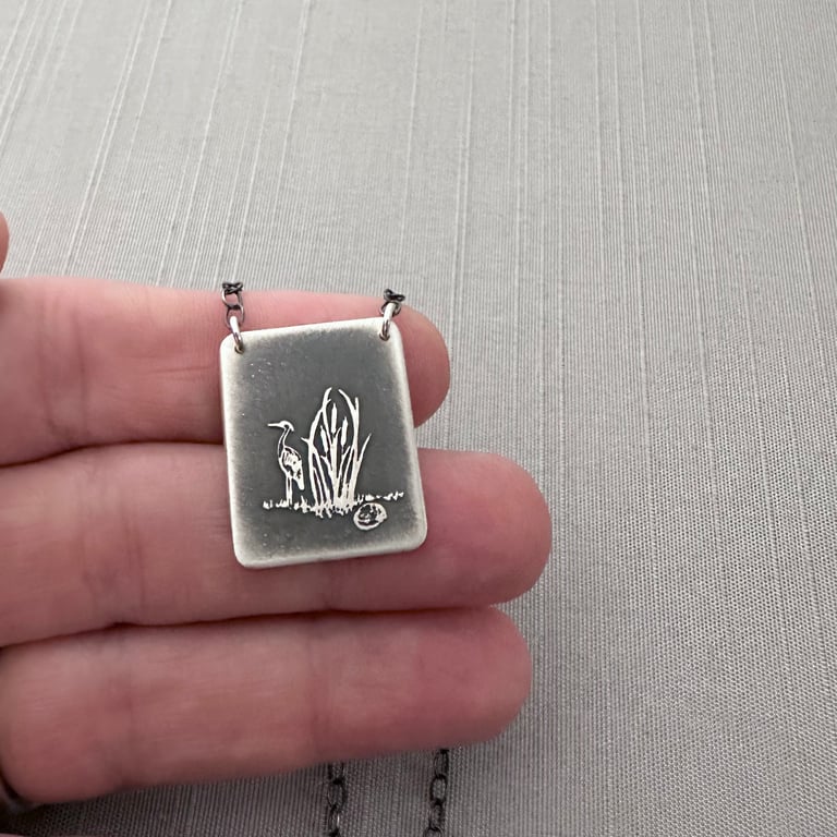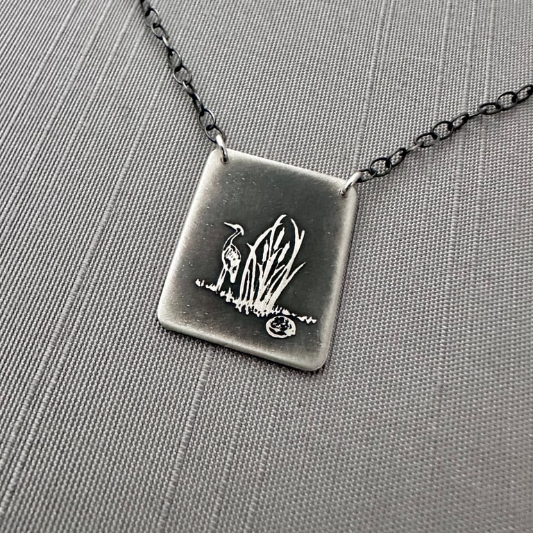 This necklace features my tiny drawing of a great blue heron and muskrat among cattails, inspired by local wetlands. I've etched it into a hand sterling rectangle pendant. I've given this piece an oxidized, brushed finish. The pendant measures 3/4" x 15/16” and hangs from an oxidized sterling silver chain.