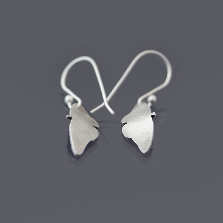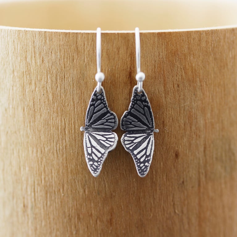 These dainty, beautifully detailed, sterling silver earrings are etched with my monarch butterfly design and hand cut from a sheet of sterling silver. They have been oxidized and then hand finished to highlight the etched design. I've given them a brushed finish. The butterflies hang from sterling silver ear wires. Each tiny butterfly measures approximately 3/4" x 3/8" and the total earring length is approximately 1-3/16 inch.