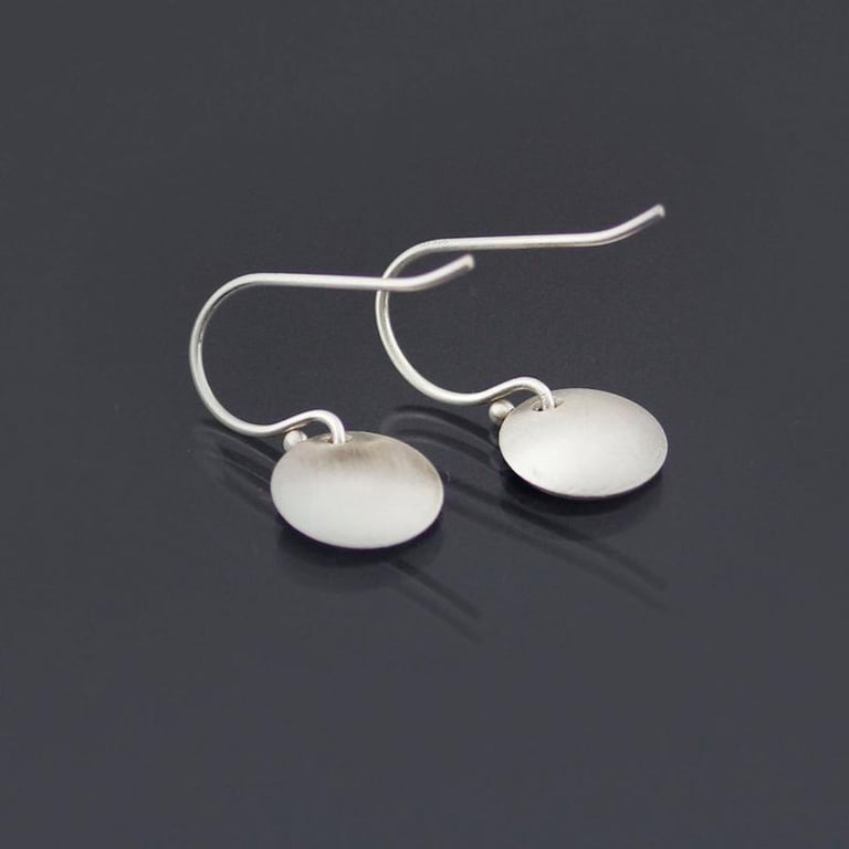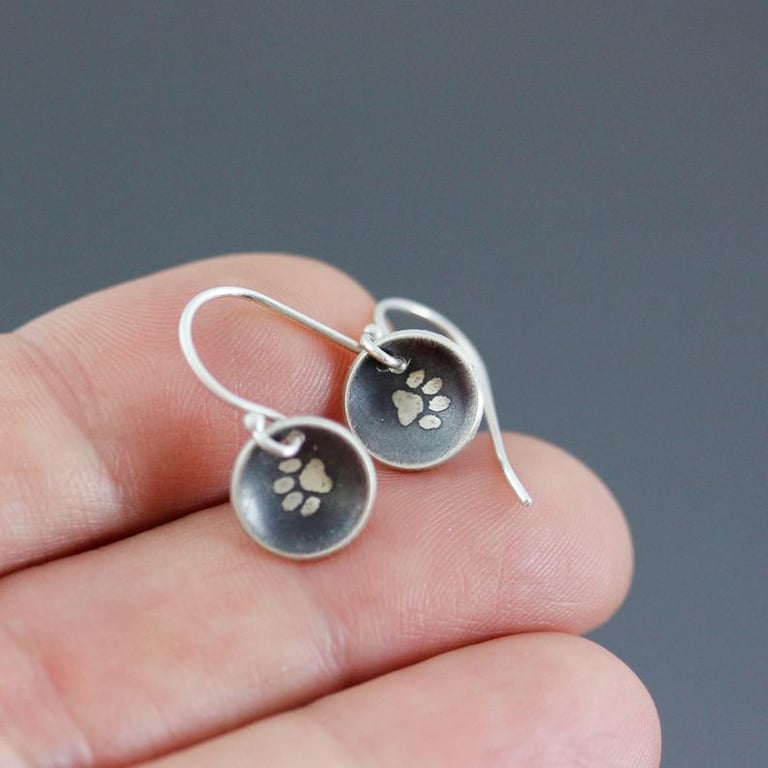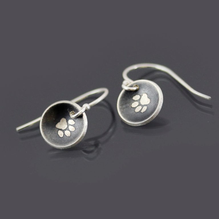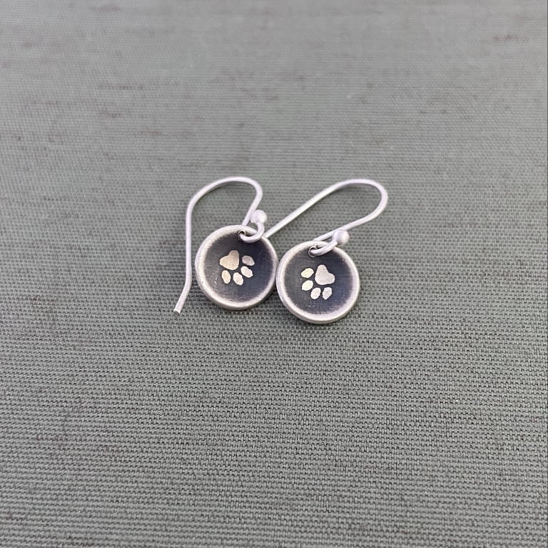 I've etched my hand drawn paw print design into hand formed sterling silver saucers. I've oxidized the background for contrast and I've given the earrings a brushed finish. The saucers hang from sterling silver earwires. The circle diameter is just under 3/8" and the total length of each earring is approximately 7/8".
