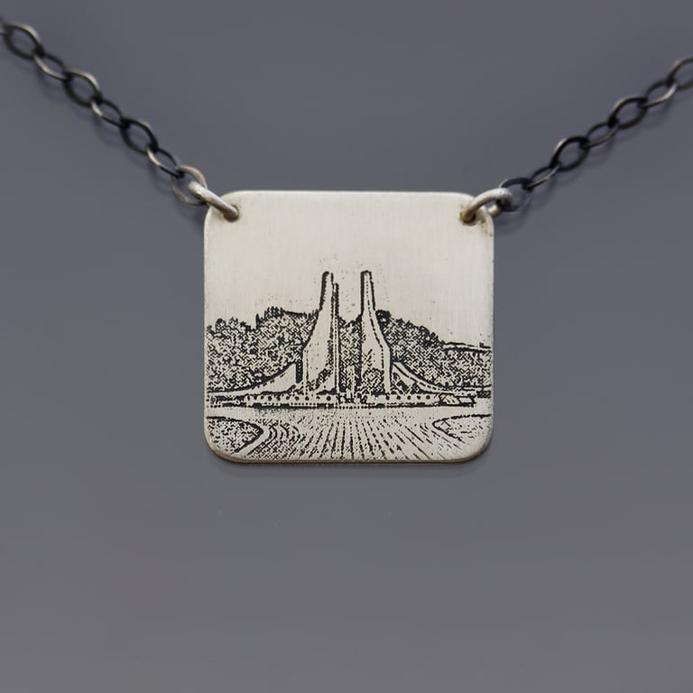 This Purdue Engineering Fountain Necklace features my image of the fountain etched into sterling silver. The image is based on my photograph. The etched silver has been oxidized for contrast and given a brushed finish. This piece measures approximately 1" x 1" and hangs from a sterling silver chain. The sterling chain is available with either an oxidized silver finish or bright silver finish. The oxidized finish is pictured