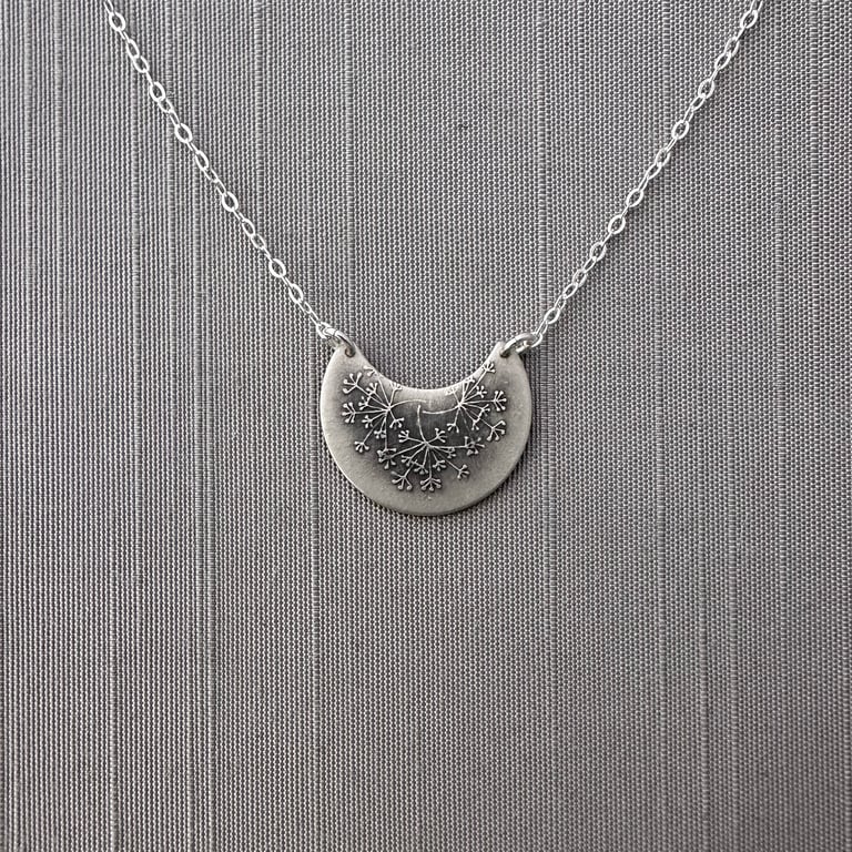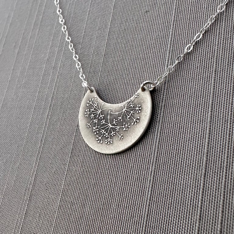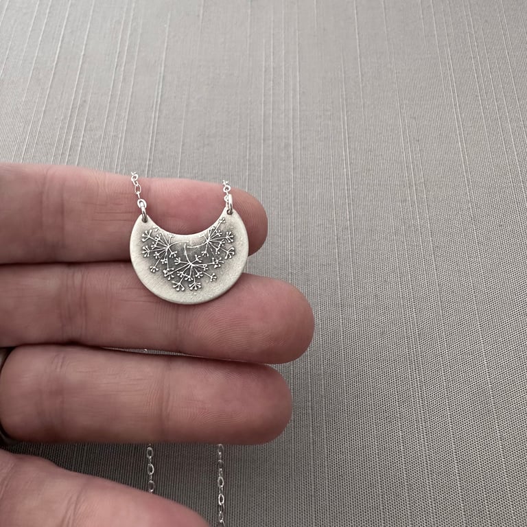 This necklace features my hand drawn queen anne's lace design that I've etched into a crescent shape. I've given this piece a lightly oxidized, brushed finish. The pendant measures 7/8" across and hangs from a sterling silver chain.