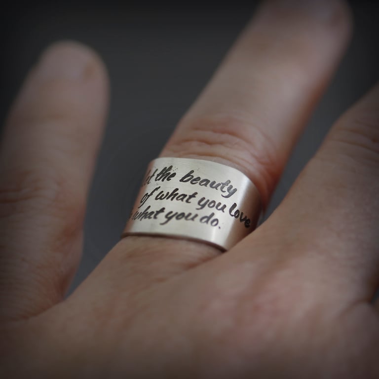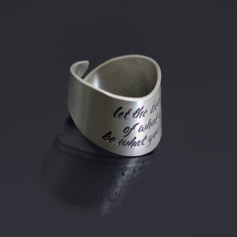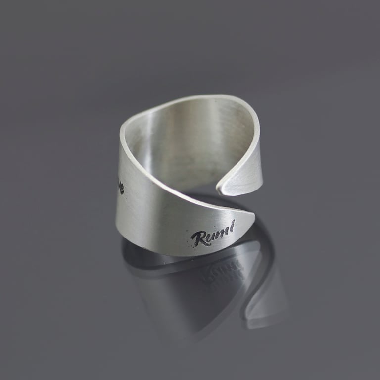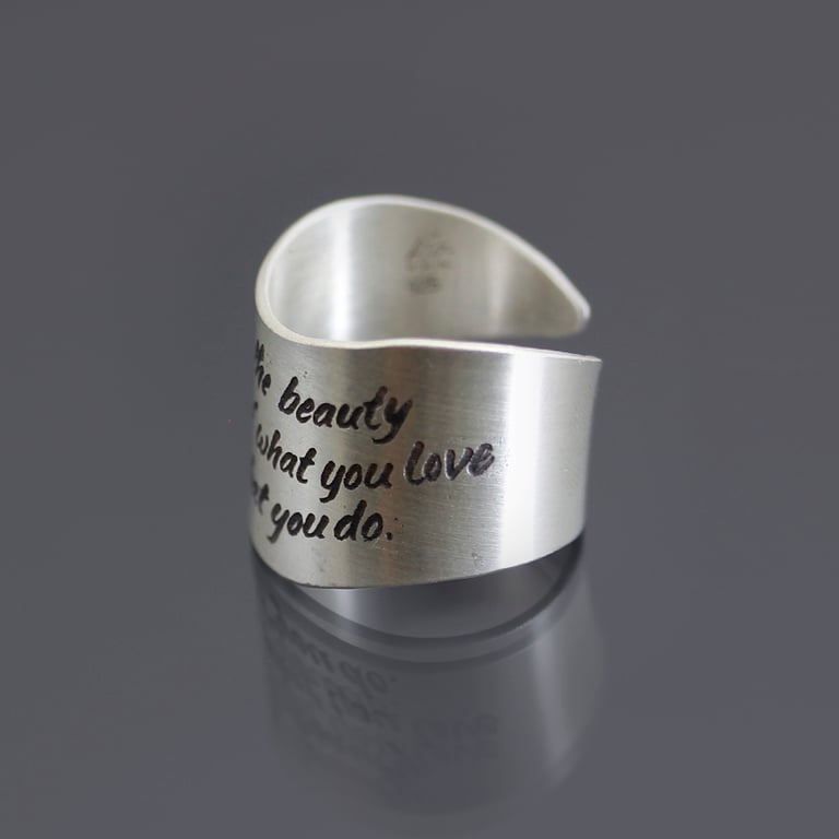 This ring features inspirational words by Rumi "Let the beauty of what you love be what you do." They have been hand written and etched into this hand fabricated sterling silver ring. The etched words have been darkened for contrast and the ring has been given a brushed finish. I've also etched the author's name at the back of the ring. Due to the asymmetrical, organic shape, the width of this ring varies--it measures approximately 5/8" at its widest part. As a wrap ring, minor size adjustments can be made by the wearer.