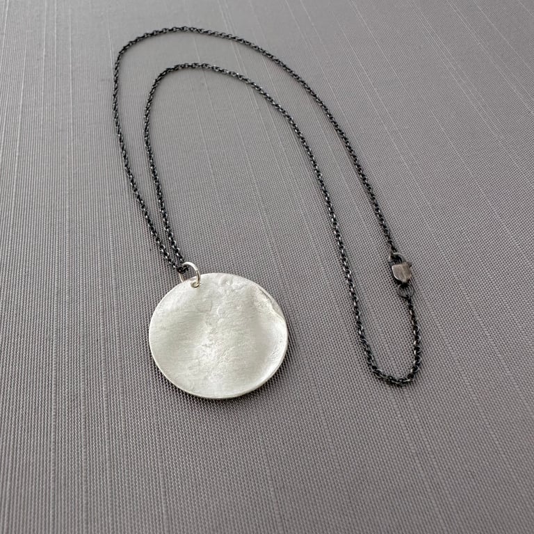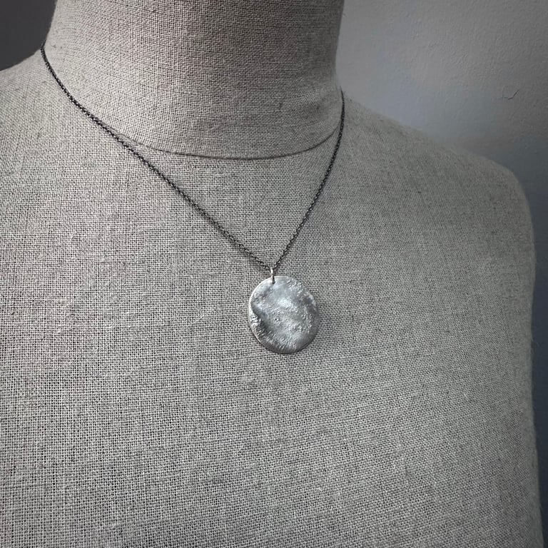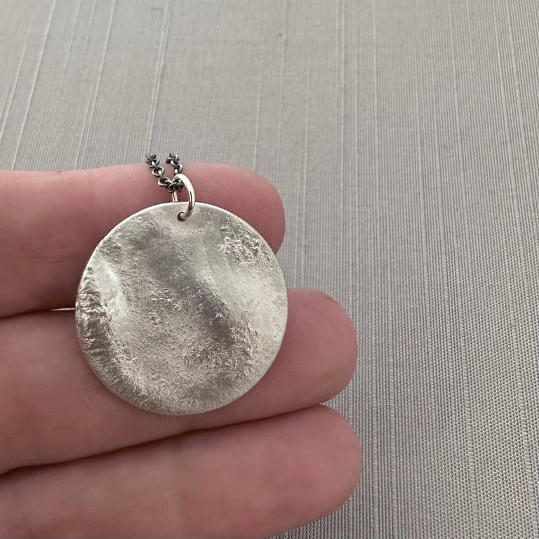 This sterling silver pendant features a highly textured surface created with flame from my torch. The pendant measures 1 inch in diameter and has been given a brushed finish. It hangs from an oxidized sterling silver chain.