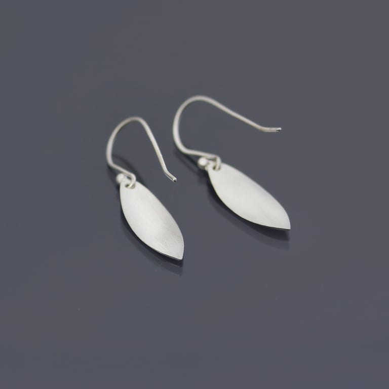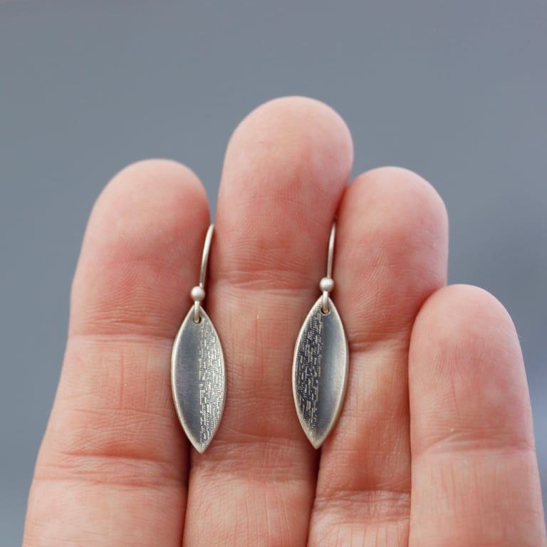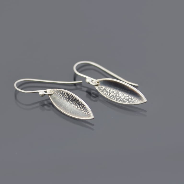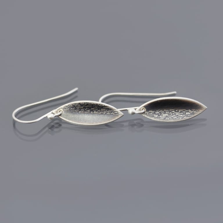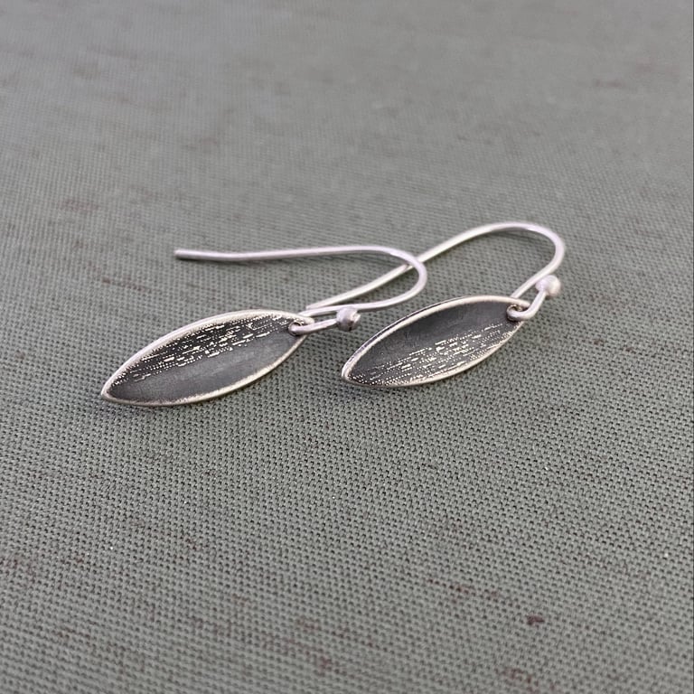 I've cut and formed small sterling silver leaf shapes and I've given them a subtle etched texture.They have been given an oxidized, brushed finish. They hang from sterling silver earwires. Each leaf measures approximately 3/4" long and the total earring length is approximately 1-1/4".