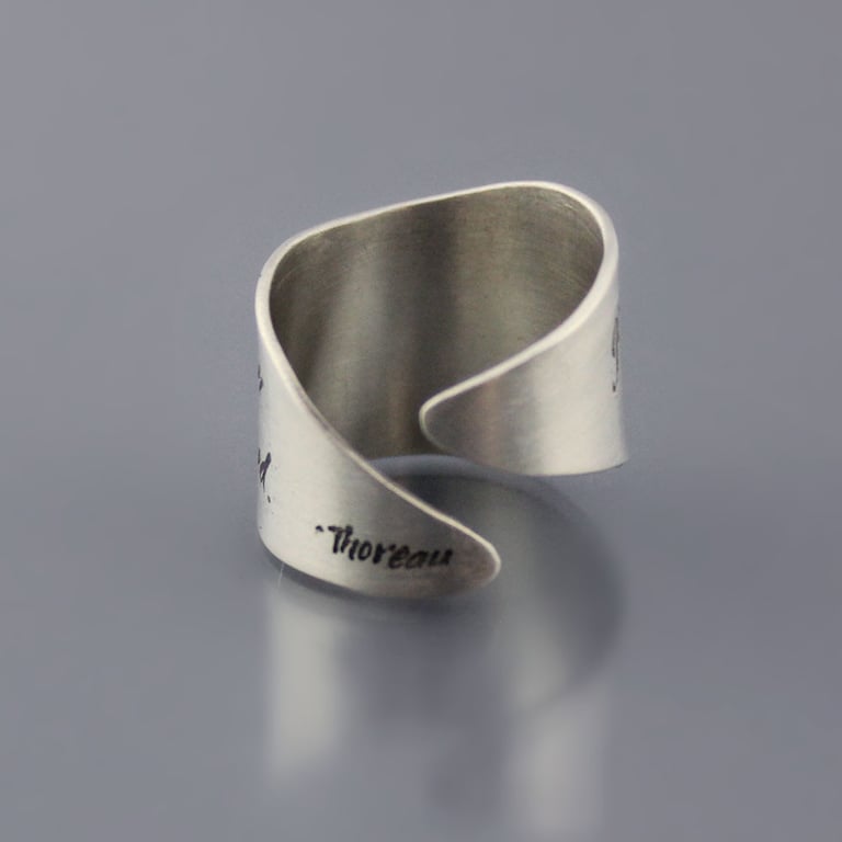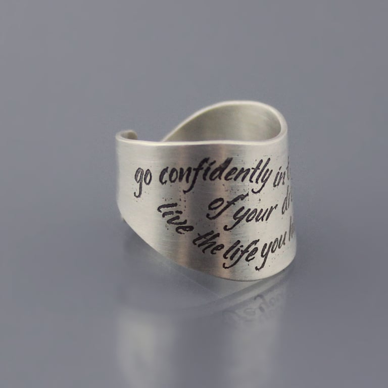 This ring features words by Thoreau: "go confidently in the direction of your dreams - live the life you have imagined." I've hand written and etched the words into this hand fabricated sterling silver ring. The etched words have been darkened for contrast and the ring has been given a brushed finish. I've also etched the author's name at the back of the ring. Due to the asymmetrical, organic shape, the width of this ring varies--it measures approximately 5/8" at its widest part.