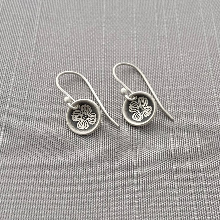 I've etched my hand drawn dogwood blossoms into hand formed sterling silver saucers. I've oxidized them and given them a brushed finish. The small circles hang from sterling silver earwires. The circle diameter is approximately 3/8" and the total length of each earring is approximately 7/8".