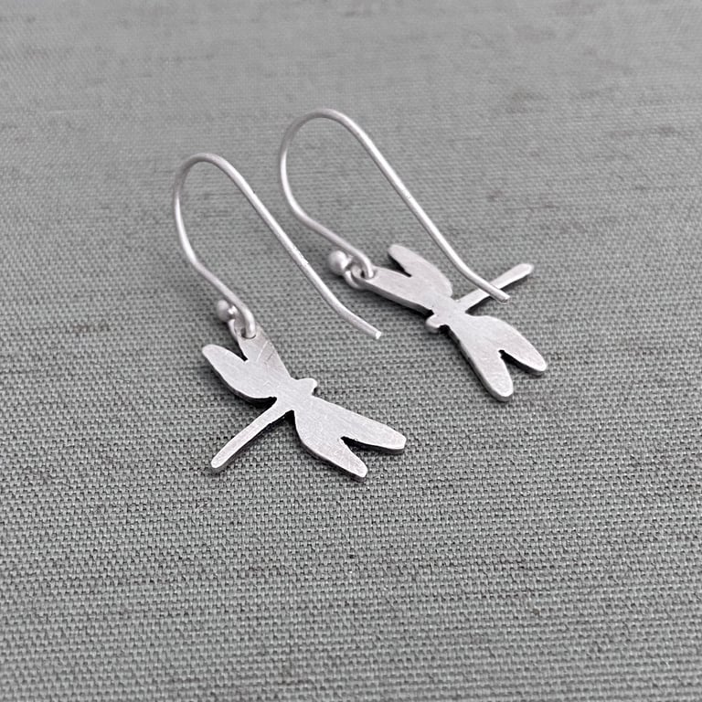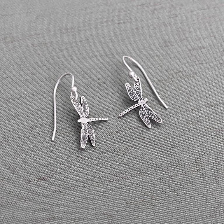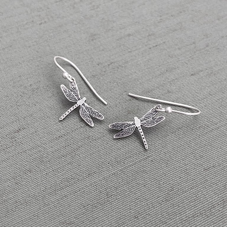 These sterling silver earrings feature my hand drawn dragonfly design that I've etched and hand cut from a sheet of sterling silver. I've oxidized and hand finished them for contrast. The total hanging length of the earrings is approximately 1-1/8.