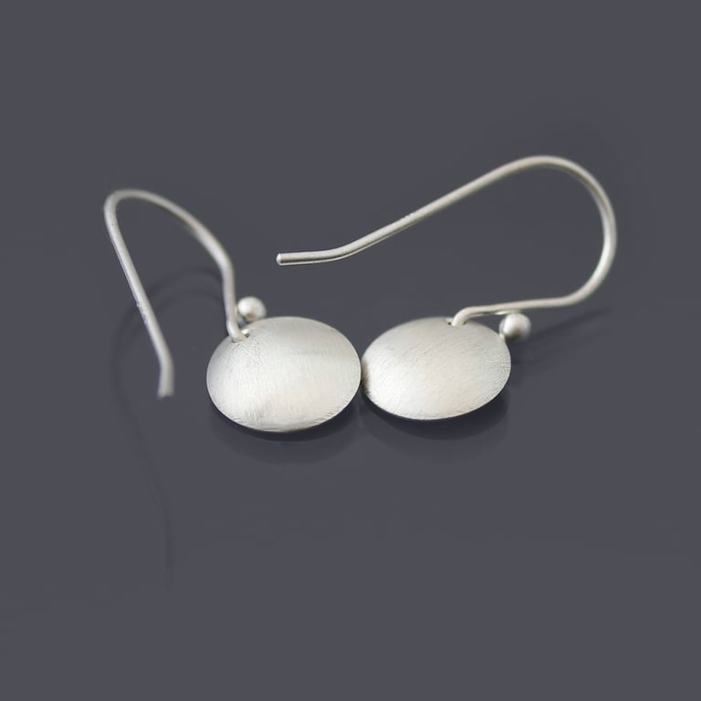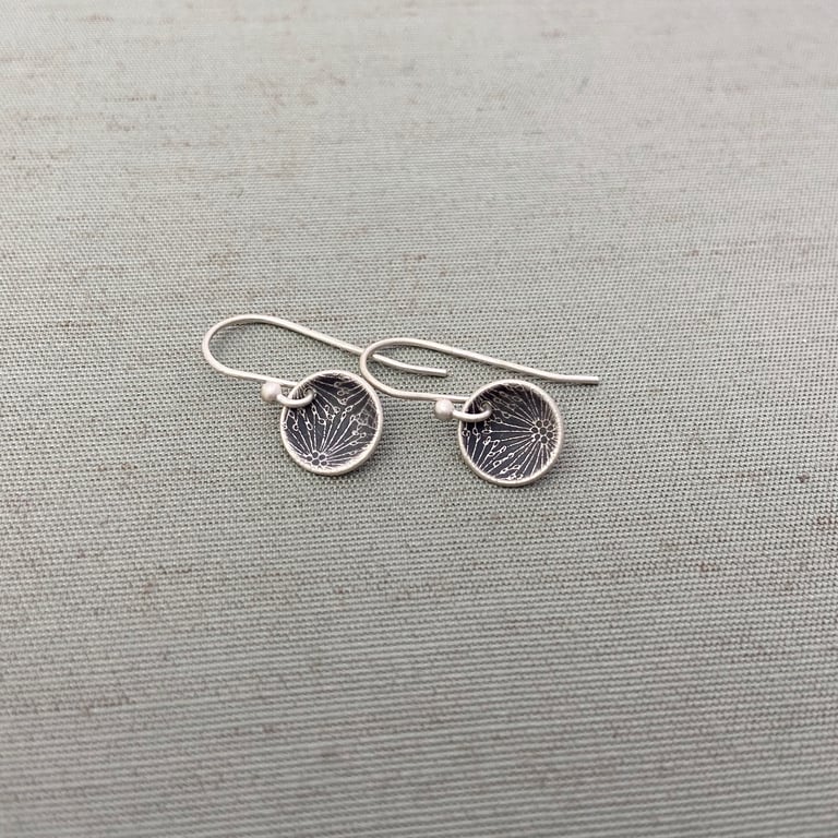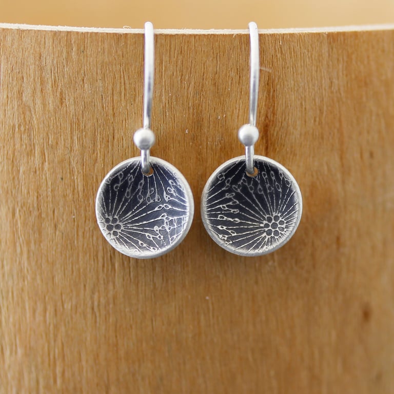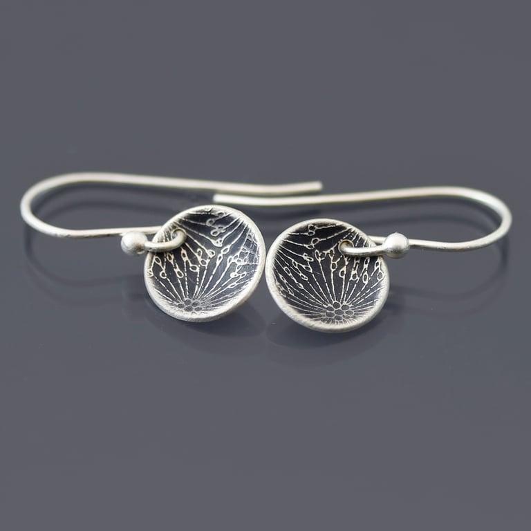 These tiny sterling silver earrings feature tiny concave saucers etched with my original hand drawn seed pod pattern. The pattern is tiny, delicate and subtle. The saucers have been given an oxidized, brushed finish. They hang from sterling silver earwires and have a total length 13/16".