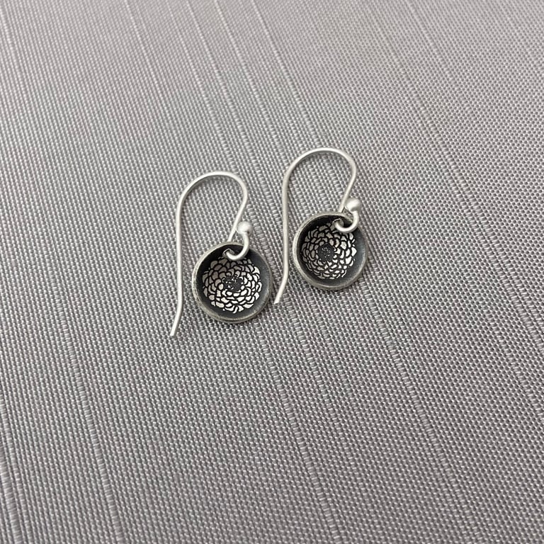 I've etched my zinnia blossoms into hand formed sterling silver saucers. I've oxidized them and given them a brushed finish. The small circles hang from sterling silver earwires. The circle diameter is approximately 3/8" and the total length of each earring is approximately 7/8".